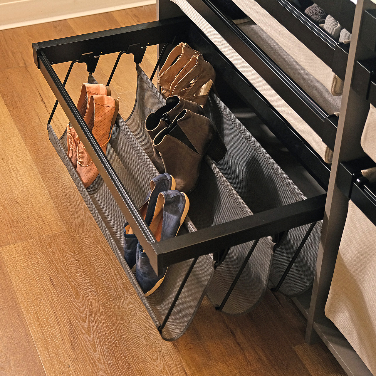 The Curate Shoe Organizer uses ventilated mesh sections to support a wide range of men’s and women’s footwear while keeping the drawer breathable and visually organized. Designed for clean presentation and easy daily access.